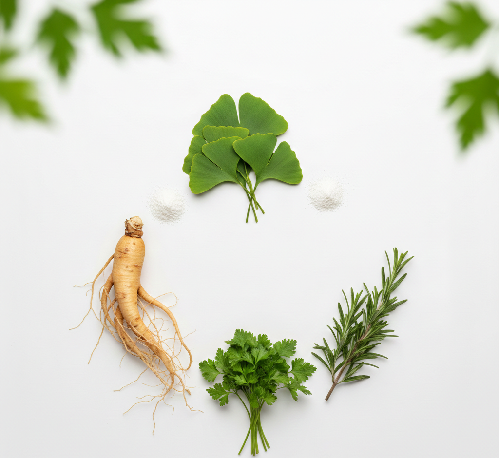 Ingredientes como ginseng, ginkgo biloba, damiana y romero han sido ampliamente estudiados por su efecto neuroprotector, antioxidante y revitalizante.